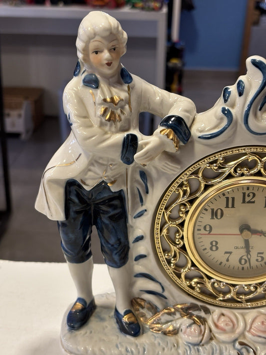Large Vintage Victorian Couple Blue and White Rococo Style Table Clock