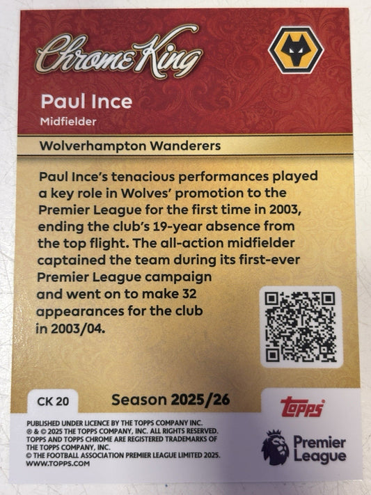 NEW - TOPPS PREMIER LEAGUE 2026 - PAUL INCE WOLVERHAMPTON CHROME KING CK20 Fresh